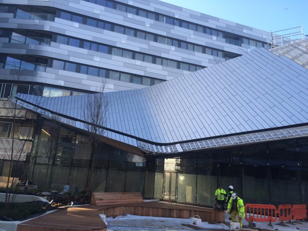 - Composite-panel façade installation, with panel-to-panel tolerance controlled across the elevation.